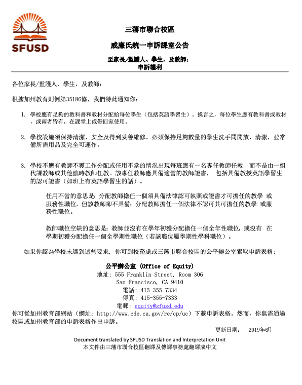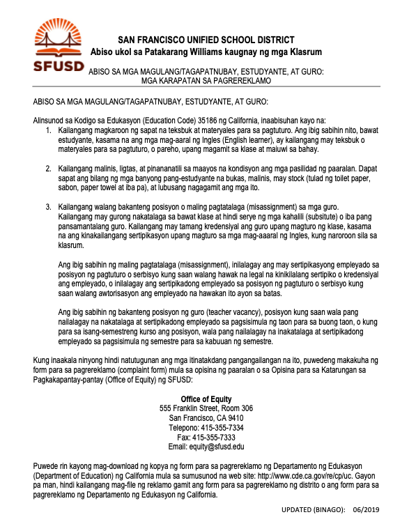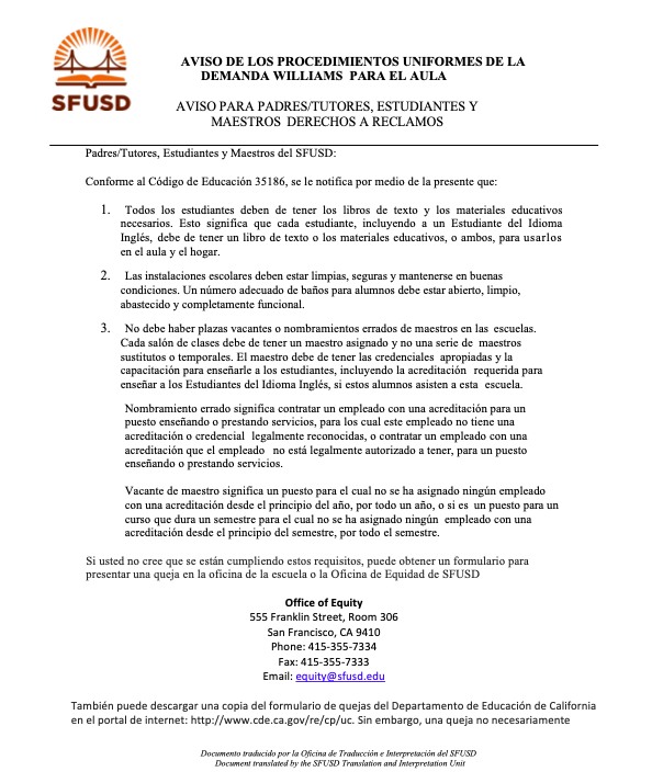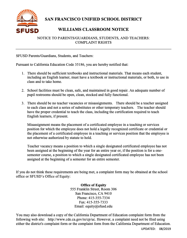A Williams Complaint allows a student, family, teacher, or any member of the public, to file grievances regarding K-12 schools for: (1) Insufficient textbooks and instructional materials; (2) Teacher vacancy or misassignment; and (3) Facility