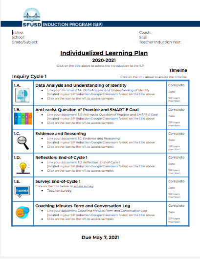 The Individualized Learning Plan (ILP) addresses the California Standards for the Teaching Profession and provides a road map for candidates’ Induction work during their time in the program along with guidance for the coach in providing support. The ILP includes candidate professional growth goals, a description of how the candidate will work to meet those goals, defined and measurable outcomes for the candidate, and planned opportunities to reflect on progress.